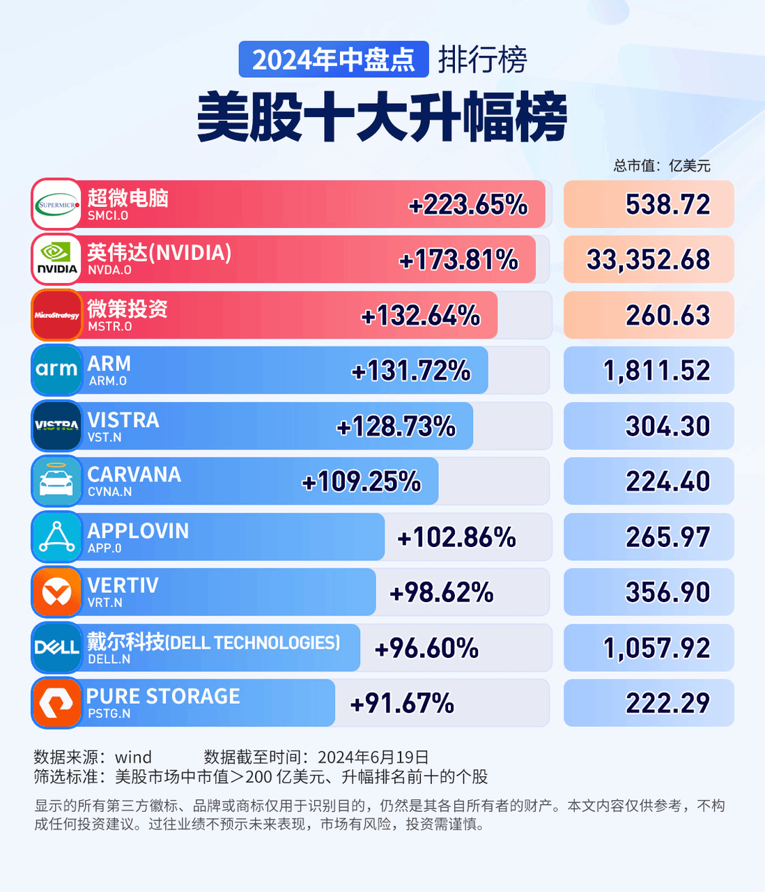 升幅榜方面,超微電腦、英偉達和微策投資以驚人的漲幅佔據了漲幅榜的前三甲。其中,英偉達在上半年無疑成為了市場中的明星企業,其“狂飆”的股價背後,是源於其強勁的業績以及晶片產品供不應求的市場局面。其股價自2023年翻倍後,今年再創新高,漲幅超160%。其合作夥伴超微電腦今年更是累計漲幅超過兩倍,自去年以來漲幅更是高達驚人的十倍。