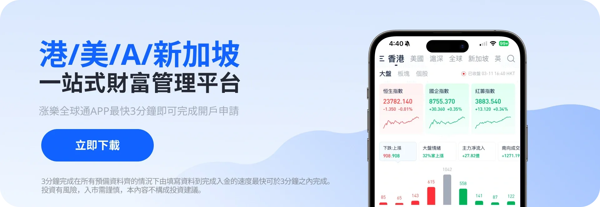 與其每天關注市場消息、擔心錯過機會,不如現在就行動!從開設投資戶口開始,邁出您的第一步。漲樂全球通覆蓋港股、美股、A股、新加坡股等多市場行情、交易、基金、閒錢理財、機械理財、保險等專業金融産品與服務,以及包括交流圈、直播、課堂等社交、投教的多元互動體驗。立即下載漲樂全球通 App和開戶操作,開展你的投資之旅。