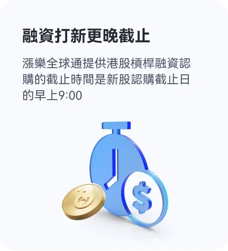 個別新股打新有不同條件及貸款要求,以上提及的優勢未必適用於所有新股打新及所有客戶,詳情請參閱漲樂全球通APP相關頁面。