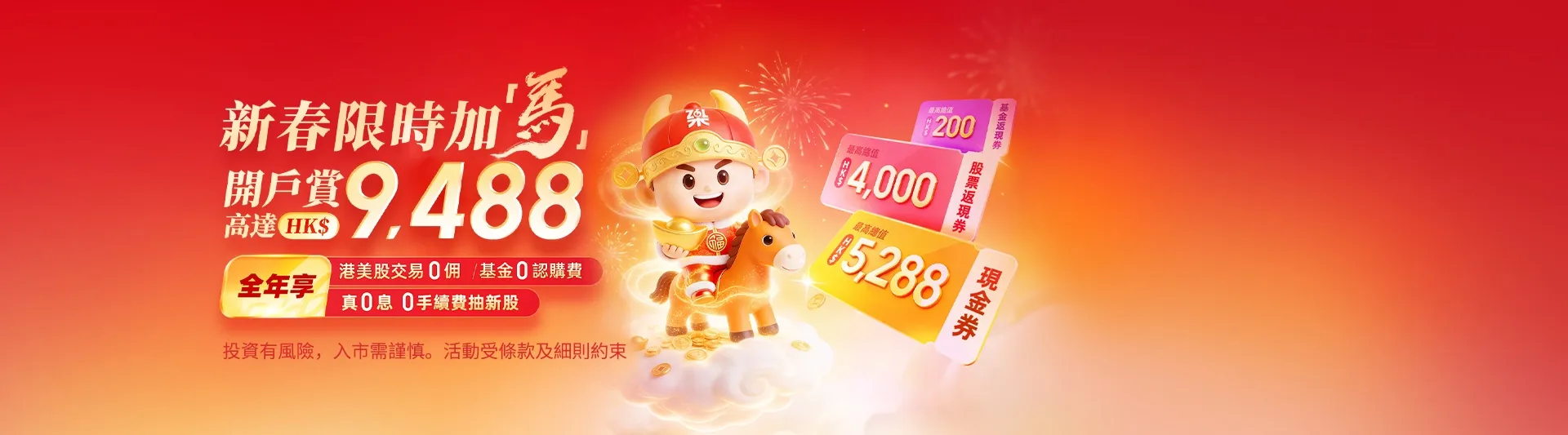 ① 新客戶在活動期內成功開戶且完成首入金≥1萬港元(或其它等值貨幣)後,在2026年12月31日及之前,交易(包括買入及賣出)港股、美股均可享受0佣金。交易標的僅包含港美股正股、ETF,但不包括輪證 、美股期權、新股暗盤等。0佣活動採用先收後返形式,在每次成功交易時,將先按原有佣金標準收費,在每個自然季度結束後的1個月內(即2026年4月、7月、10月及2027年1月),再以港元及美元賬戶現金的方式返還至客戶的證券帳戶。返還佣金不設置交易次數及額度上限。