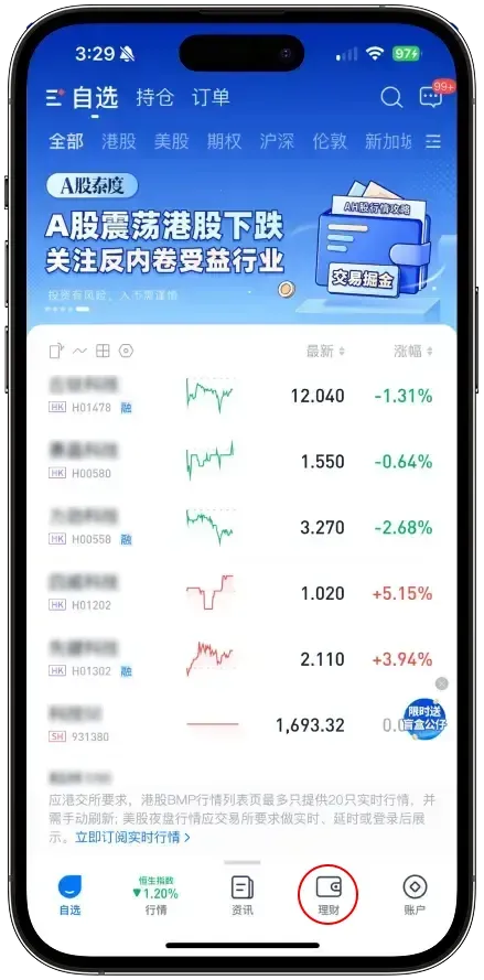 登入涨乐app,点击【底部横杆】,选择【理财】